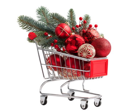 Festive Shopping Cart Full of Red Christmas Ornaments and Fir Branches isolated on transparent background