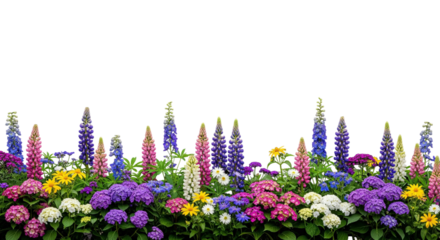 Colorful Garden of Blooming Flowers Including Lupines, Daisies, and Hydrangeas on White Background