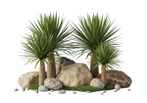 Desert Landscape with Yucca Plants, Rocks, and Green Grass