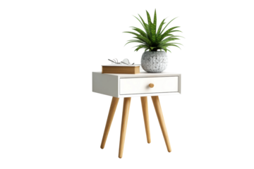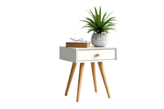 Modern white nightstand with potted plant and book on wooden legs, cut out