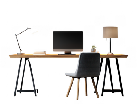 Modern minimalist office desk with computer, lamp, and decor on clean white background, isolated for business workspace design concepts. 3D Rendering