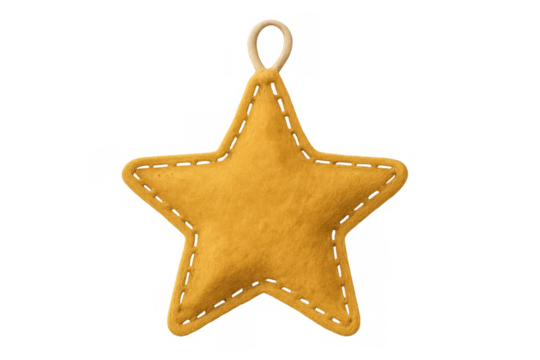 Yellow felt star christmas ornament hanging with visible stitches and transparent background, perfect for holiday projects