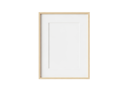 Rectangular light wood frame with white inner matte centered on a transparent wall, photorealistic, high-key lighting, ample copy space, concept for minimalist design mock-up