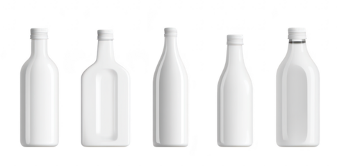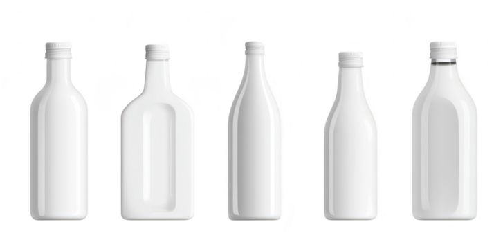 Arrangement of various minimalist white containers packages canisters and jars isolated on a transparent background