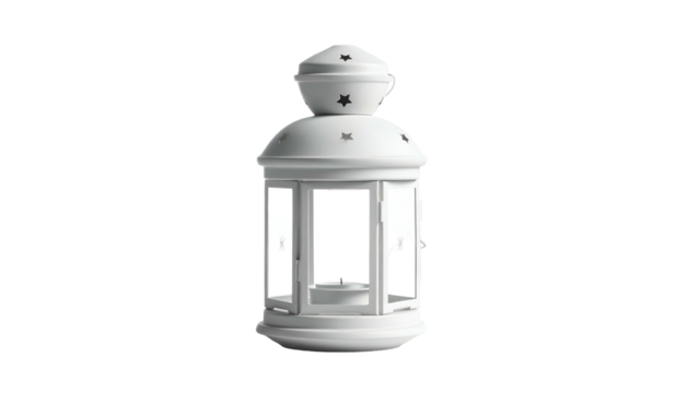 A black matte metal lantern with star cutouts and a lit candle glows against a dark black background.