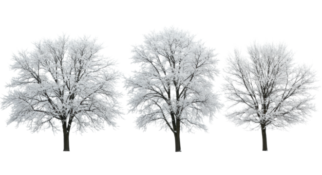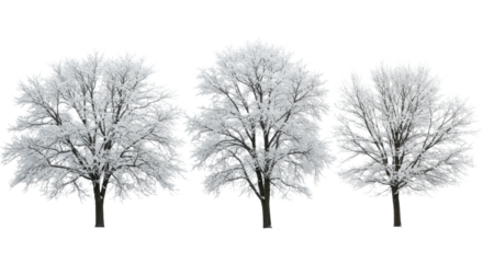 ultra-detailed photorealistic studio shot of isolated bare deciduous trees (maple, cherry) covered in shimmering rime frost and snow, arranged horizontally against a seamless high-key white void,