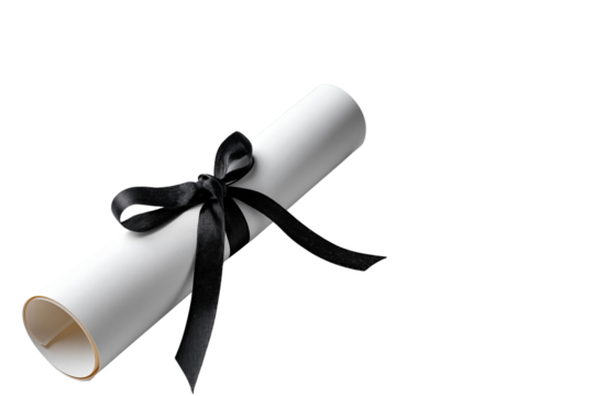 Rolled-up white diploma tied with a black ribbon, isolated on black background. Elegant and minimalistic representation of graduation or academic achievement