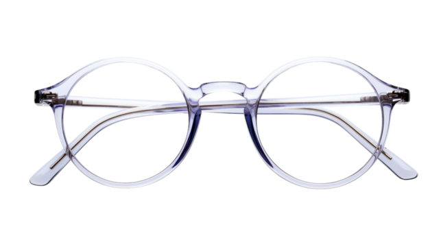 A pair of clear glasses resting on a white background