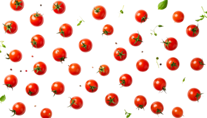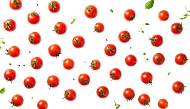 Red cherry tomatoes and basil leaves on a black background