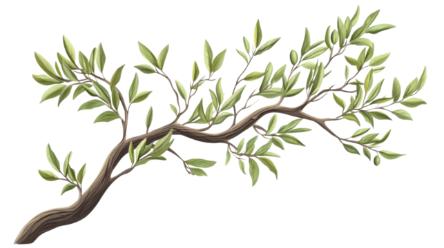 Watercolor painting of an olive branch with blue leaves on transparent background