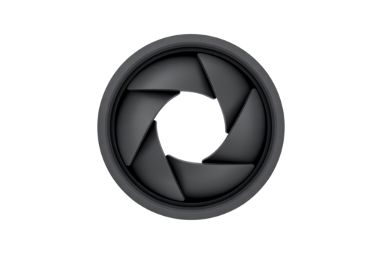 A minimalistic 3D render of a dark gray camera aperture with six blades, slightly open, centered on a solid transparent background. background removed