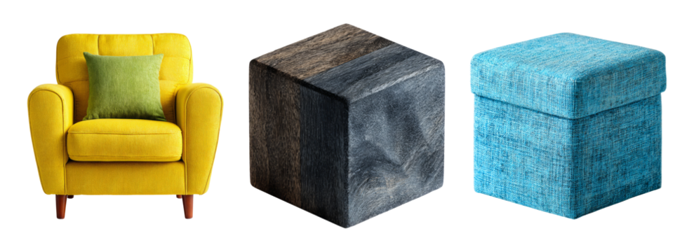 Bright Yellow Couch and Unique Accent Pieces on Transparent Background