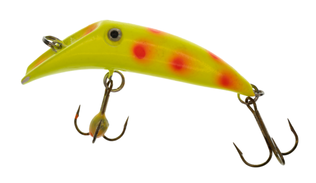 A bright yellow fishing lure with two treble hooks and black eye on a transparent background