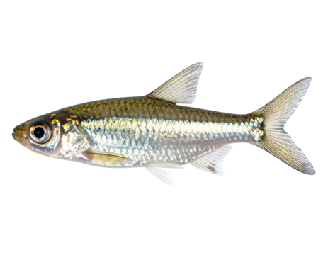 Silver freshwater minnow in side profile with shiny reflective scales on isolated background