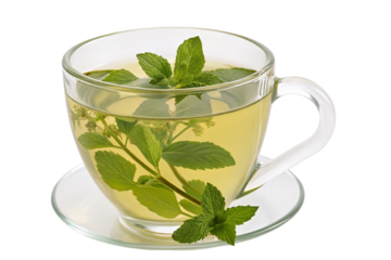 Refreshing mint tea in a clear glass cup with fresh green leaves for soothing relaxation benefits