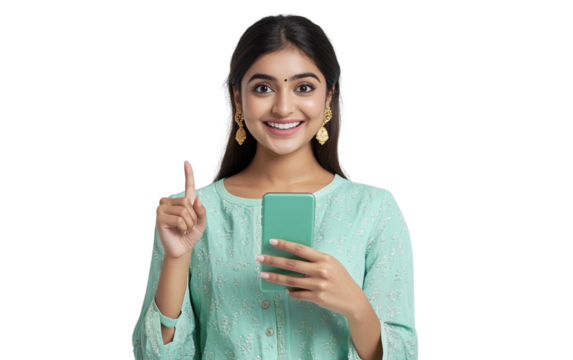 Excited Indian woman in a mint green kurta holding a smartphone horizontally, pointing at the screen with a joyful expression, set against a white background.