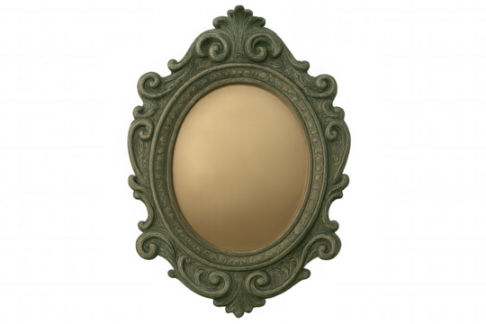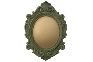 Oval mirror featuring an ornate green frame, isolated on a transparent background, perfect for interior design visualizations