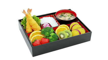 Japanese Bento Box with Ebi Fry, Rice, Miso Soup, and Fruits