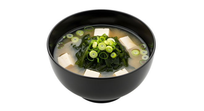 Healthy Japanese vegetable soups with tofu and seaweed low-fat on transparent background