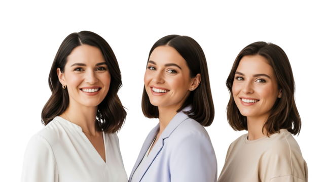 Three young women with brown hair smiling at camera on black background isolated on white transparent png background download