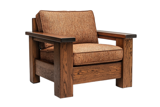 Brown cushioned wooden armchair with classic mission style design isolated transparency
