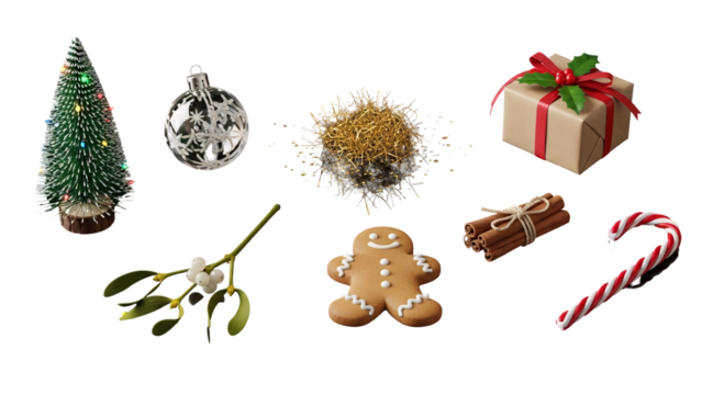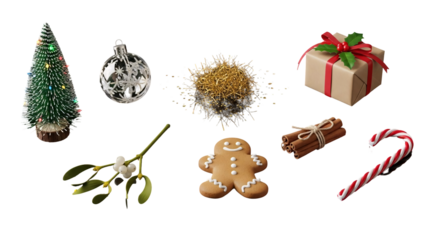 Collection of Christmas Holiday Objects and Decorations.