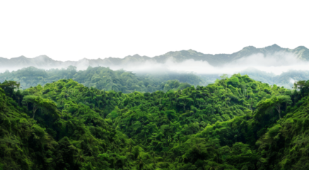 Dense green jungle and distant misty peaks, isolated on transparent cutout background