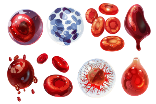 A set illustrations showcasing different types of human cells, including red blood cells, white blood cells, and platelets.