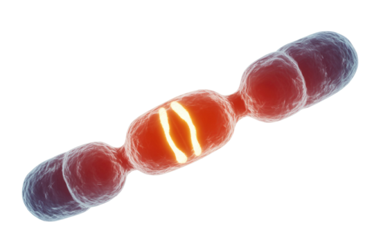 A 3D render of a chromosome-like structure in dark red with glowing yellow U-shaped regions at its chromatid ends. background removed