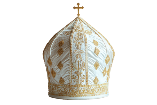 Ornate bishop's mitre with gold embroidery, white fabric, tall ceremonial headdress, Christian religious attire, isolated on white.