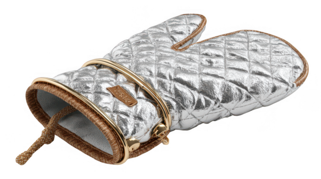 Silver quilted oven mitt with gold trim on transparent background