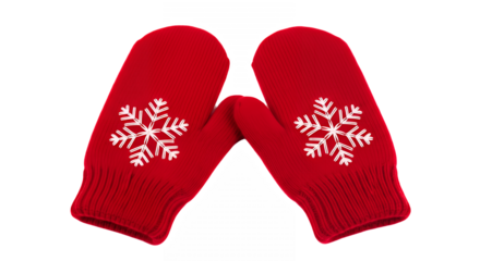 Pair of red knitted mittens with white snowflake design on transparent background