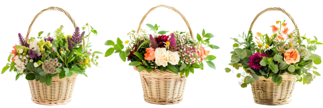 set of baskets of mixed blooms, each featuring an array of flowers and leaves chosen for their complementary colors and textures, isolated on transparent background