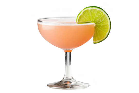 A pink cocktail in a coupe glass garnished with a fresh lime wheel. Png, Transparent background.