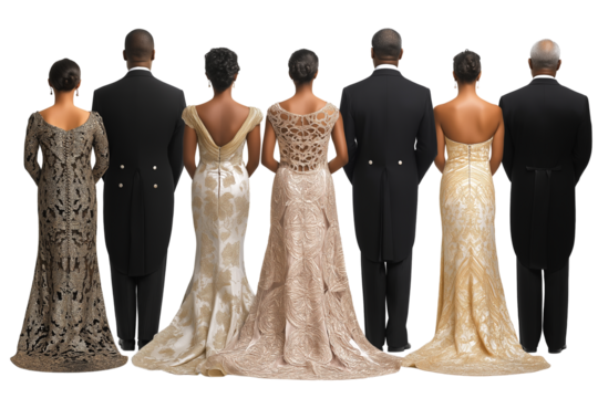 A diverse group of business professionals, men and women, standing in a line against a transparent background