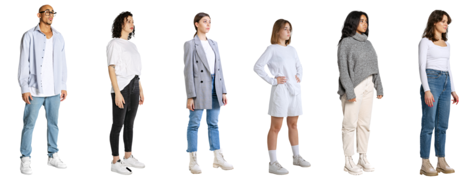 Three friends in white outfits sharing a joyful moment isolated on transparent background