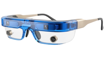 Blue augmented reality glasses isolated PNG, smart eyewear with built-in cameras for virtual reality and mixed reality applications