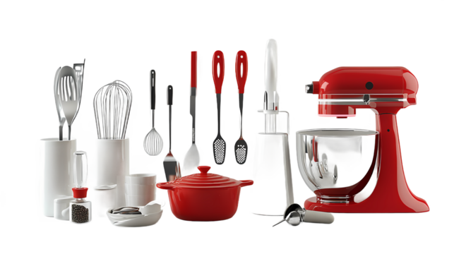 Kitchen scene showcasing a vibrant red mixer surrounded by various cooking utensils and tools