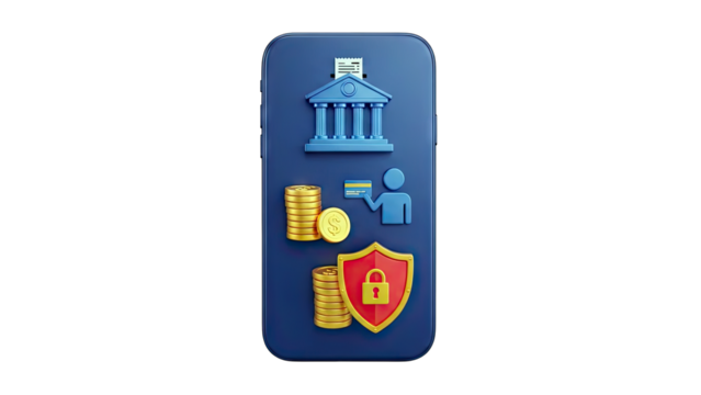 Mobile Banking App with Financial Icons on White Background