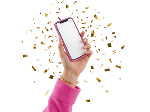 Elevated hand showcasing mobile device with a blank screen amidst a burst of golden confetti on an