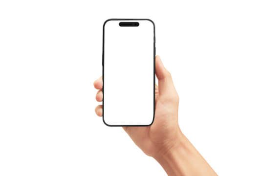 Hand holding blank smartphone studio digital mockup isolated. Isolated on transparent background, png.