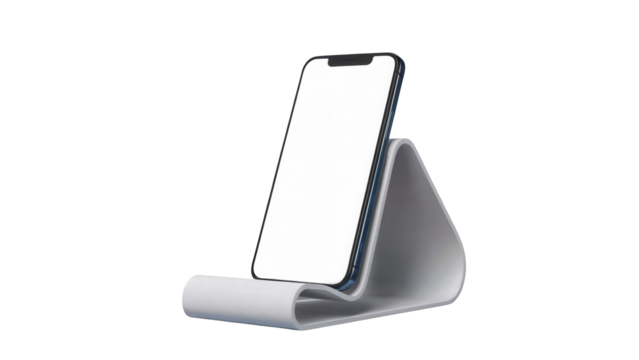 Modern minimalist gray smartphone holder stand with blank screen for mobile device on a transparent background isolated on transparent background