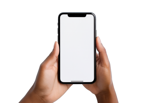 mockup Hand Holding mobile phone with white screen isolated on transparency background Template