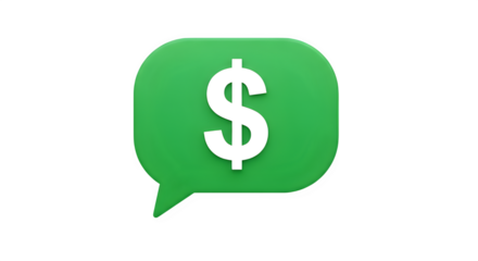 Green chat bubble with white dollar sign icon for mobile payment or money transfer concept isolated on transparent background