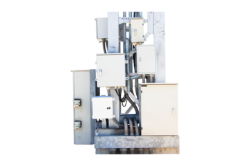 Group box Communication tower telephone pole wireless communication technology installed on large electric pole. Telecommunication of 4G and 5G cellular. Smart antennas mounted isolated on cutout PNG.