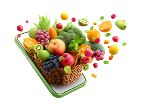 Fruits and vegetables in a basket flying out from a phone screen isolated on a transparent background