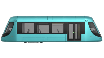 Modern turquoise tram PNG isolated on transparent background, public transportation vehicle for urban mobility and city travel