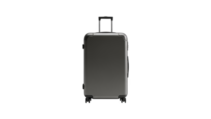 A sleek gray suitcase with a black handle stands alone on a transparent background, ready for travel