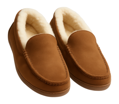 Comfortable tan moccasin slippers on transparent background, soft.