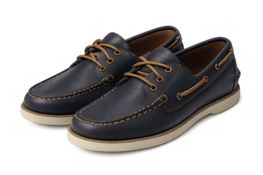 Pair of navy blue leather boat shoes for men with brown laces and white sole, isolated on transparent background